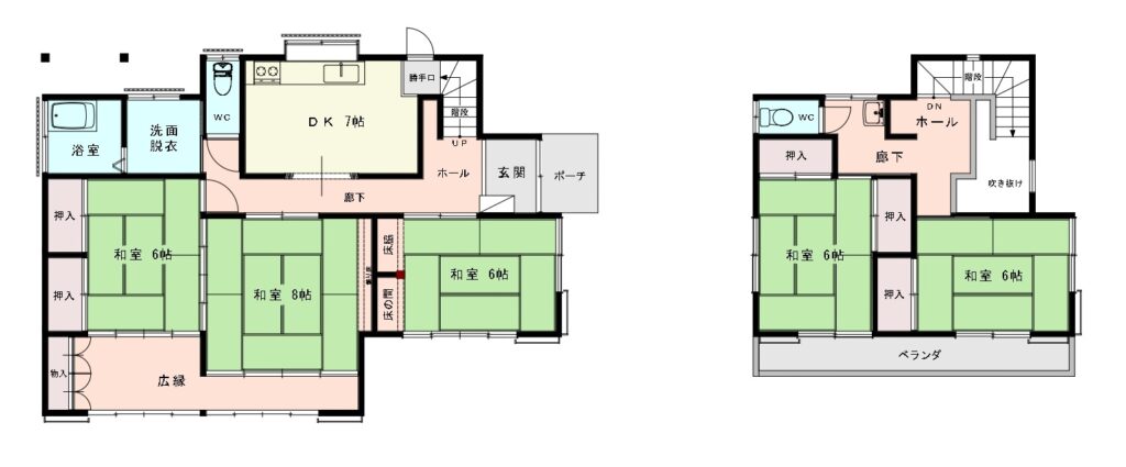 建物は木造瓦葺2階建て、間取りはゆとりある5DK。